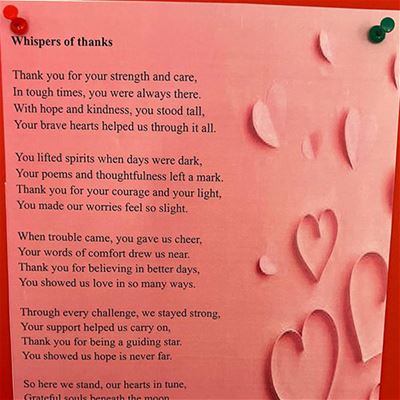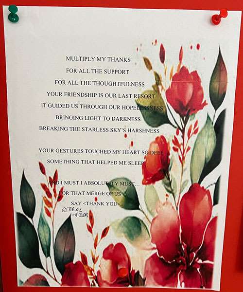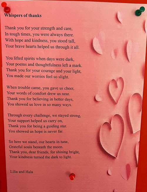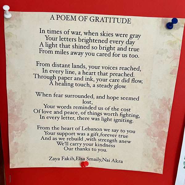 As part of the twinning between Saint Joseph Tassin and Carmel Saint Joseph Mechref, and in order to offer support, students from Saint Joseph Tassin wrote poems to uplift and encourage theirs peers in Lebanon in Grade 7 during the war they had witnessed at the beginning of this school year.